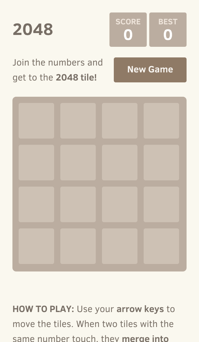 New GameWhat this is: This is a slightly modified version of the game "2048," by Gabrielle Cirulli. It is a trainer that allows you to begin with the 2048 tile already present, so that you can focus on the more challenging step of reaching 4096.